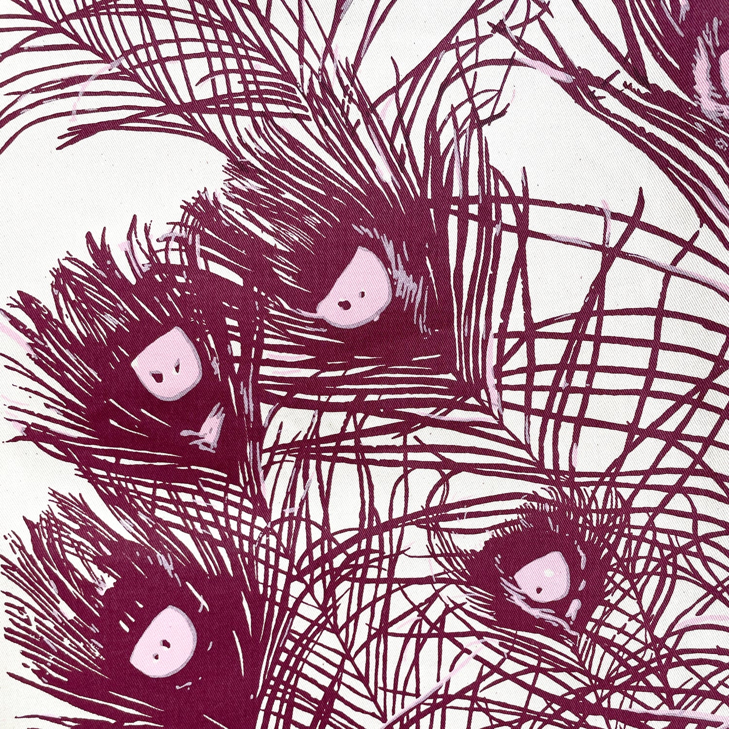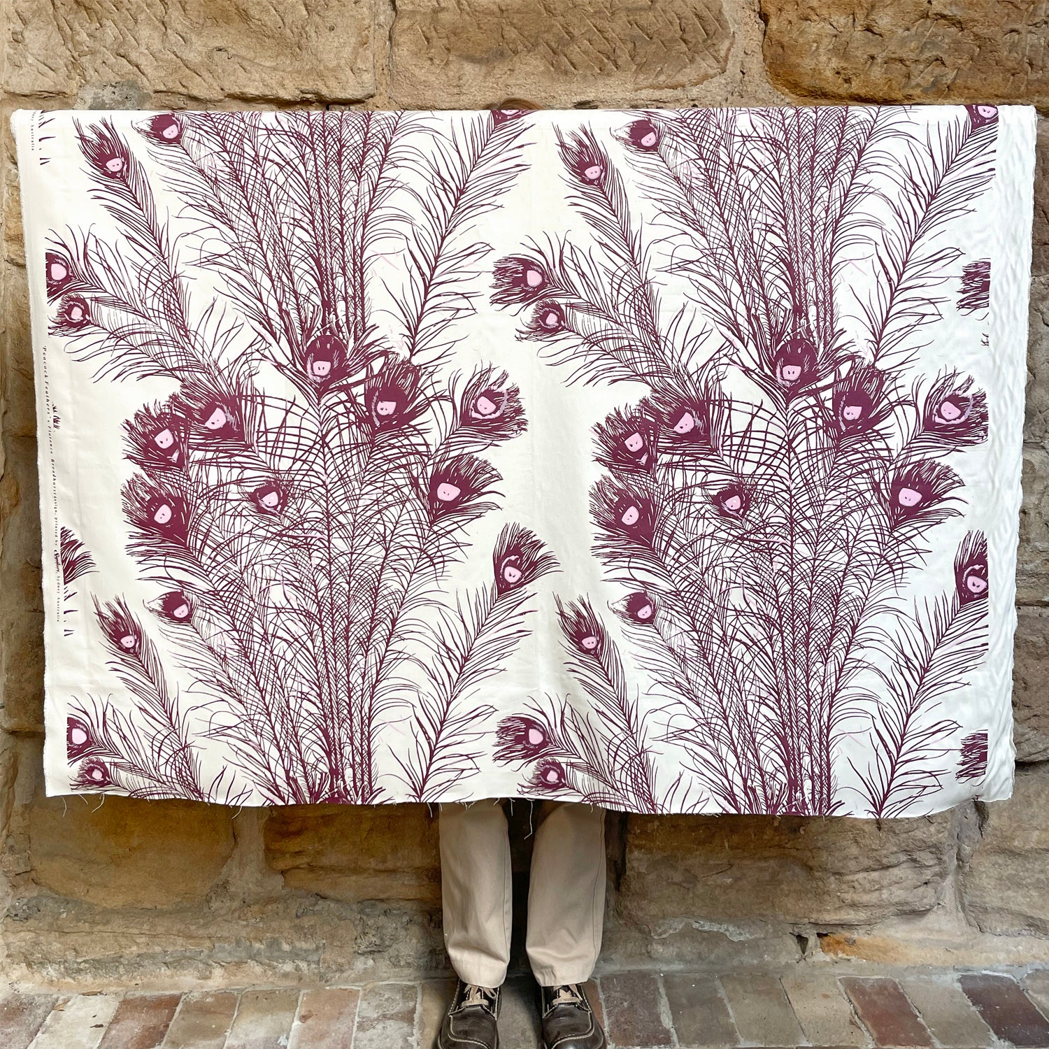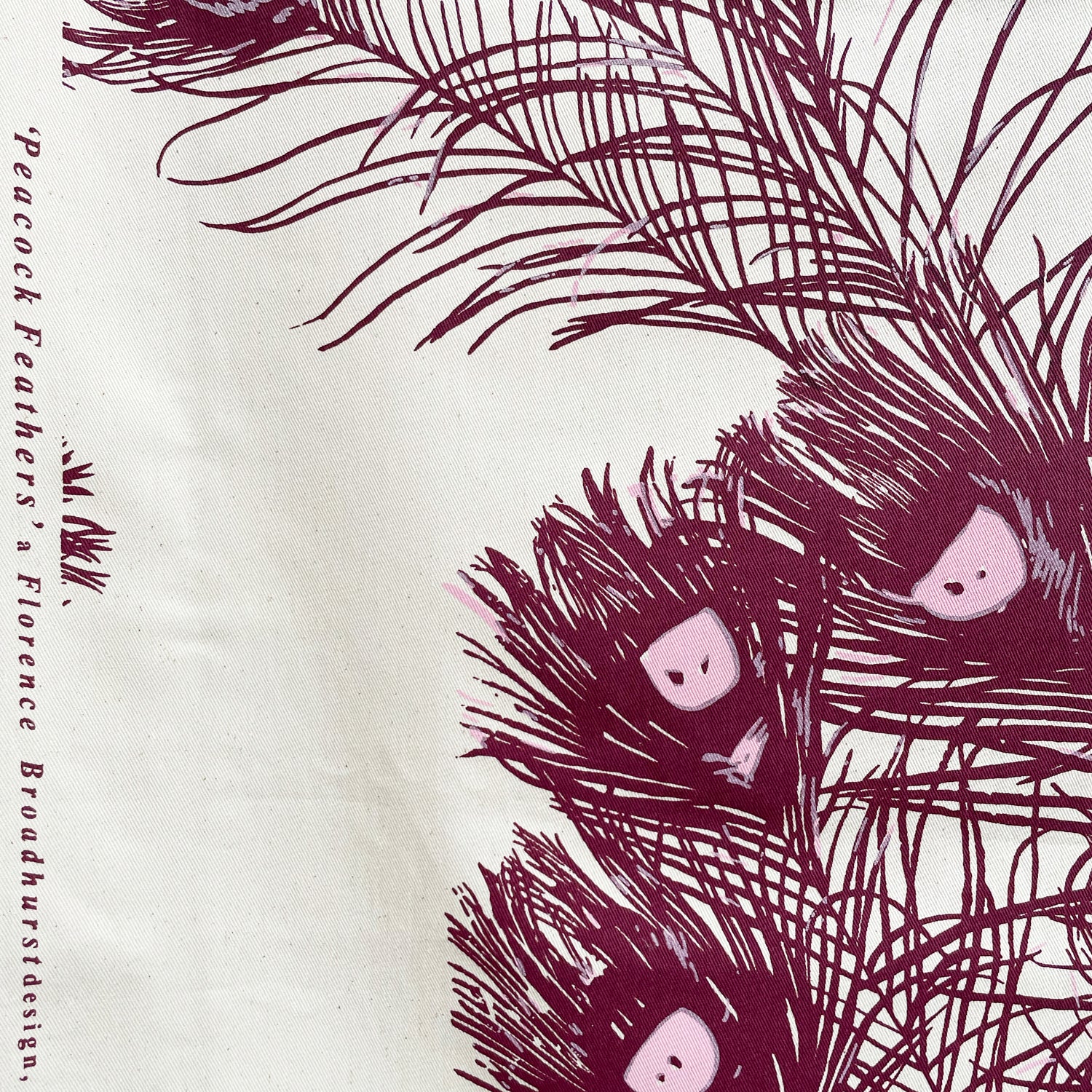 An original hand screen-printed fabric by Signature prints featuring large peacock feathers in a bold ruby colourway.