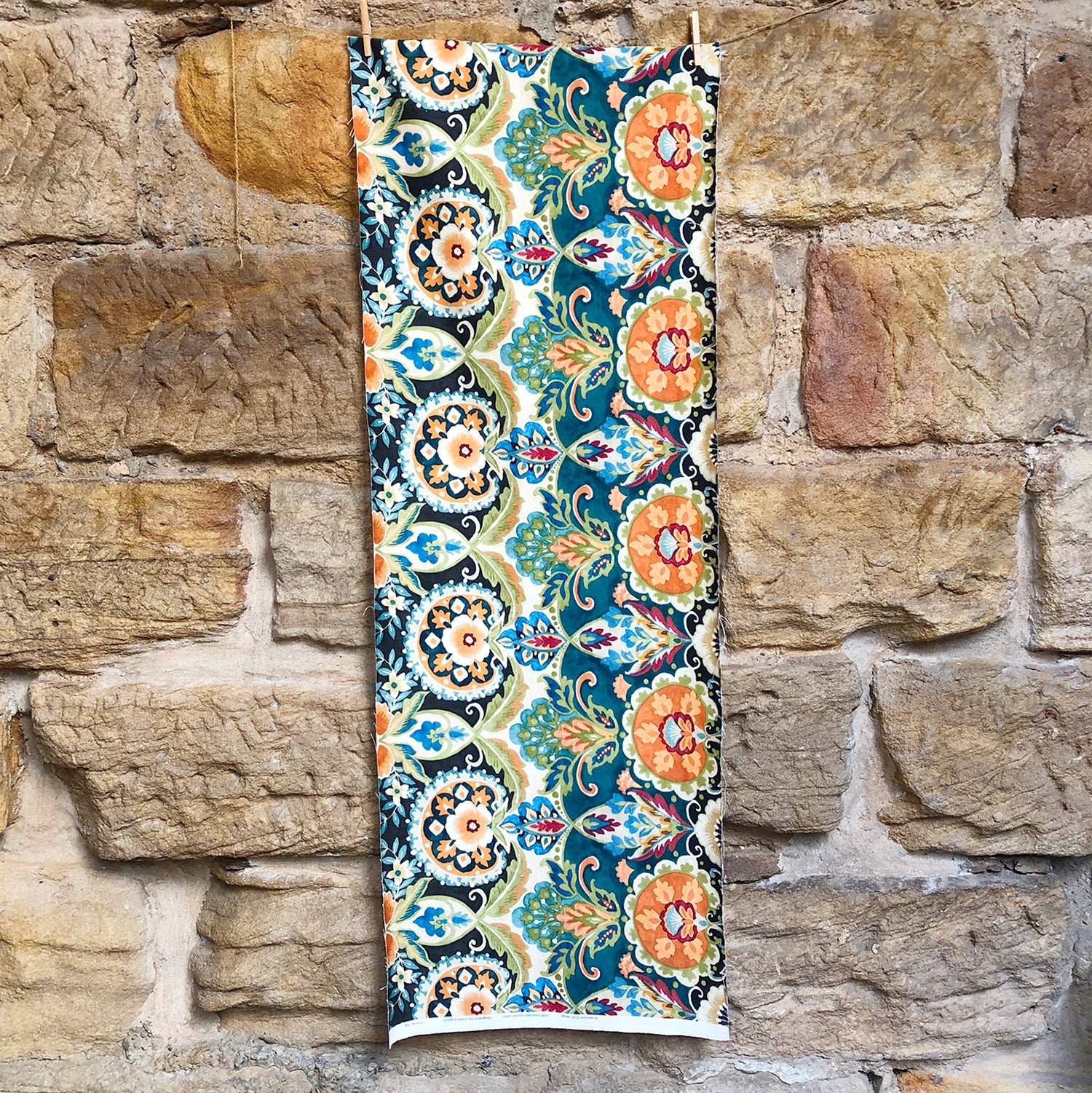An art deco inspired floral featuring jewel tone colours. The perfect fabric to add impact to a DIY upholstered stool or ottoman project.