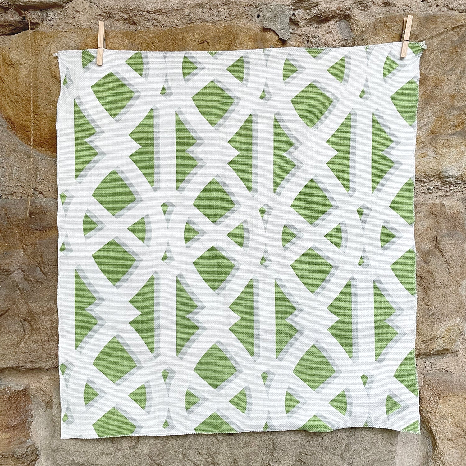 A lattice style design in fresh kelly green and white. Printed in large scale on a basket weave cotton, this remnant has great texture - the perfect piece to make a feature cushion or tote bag.