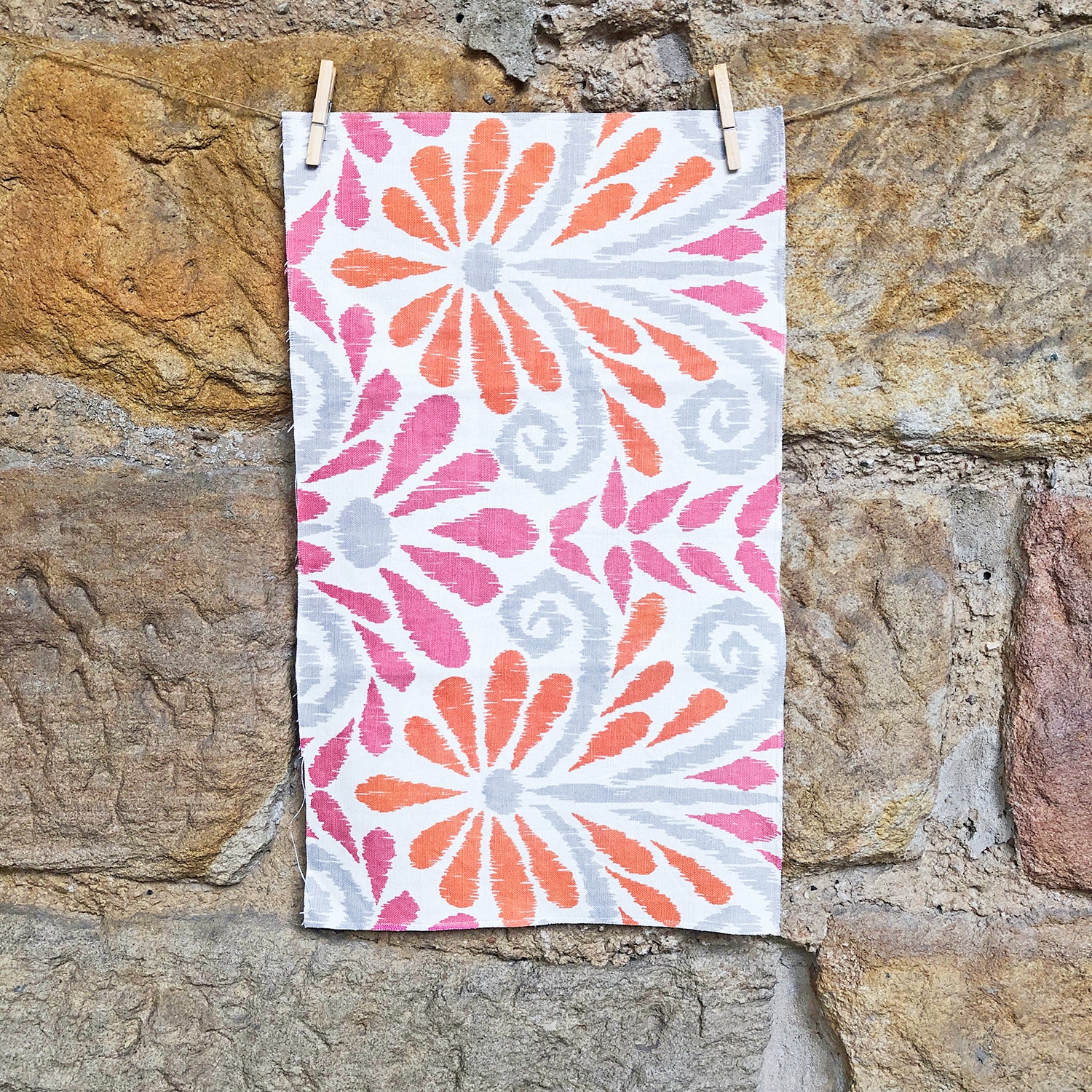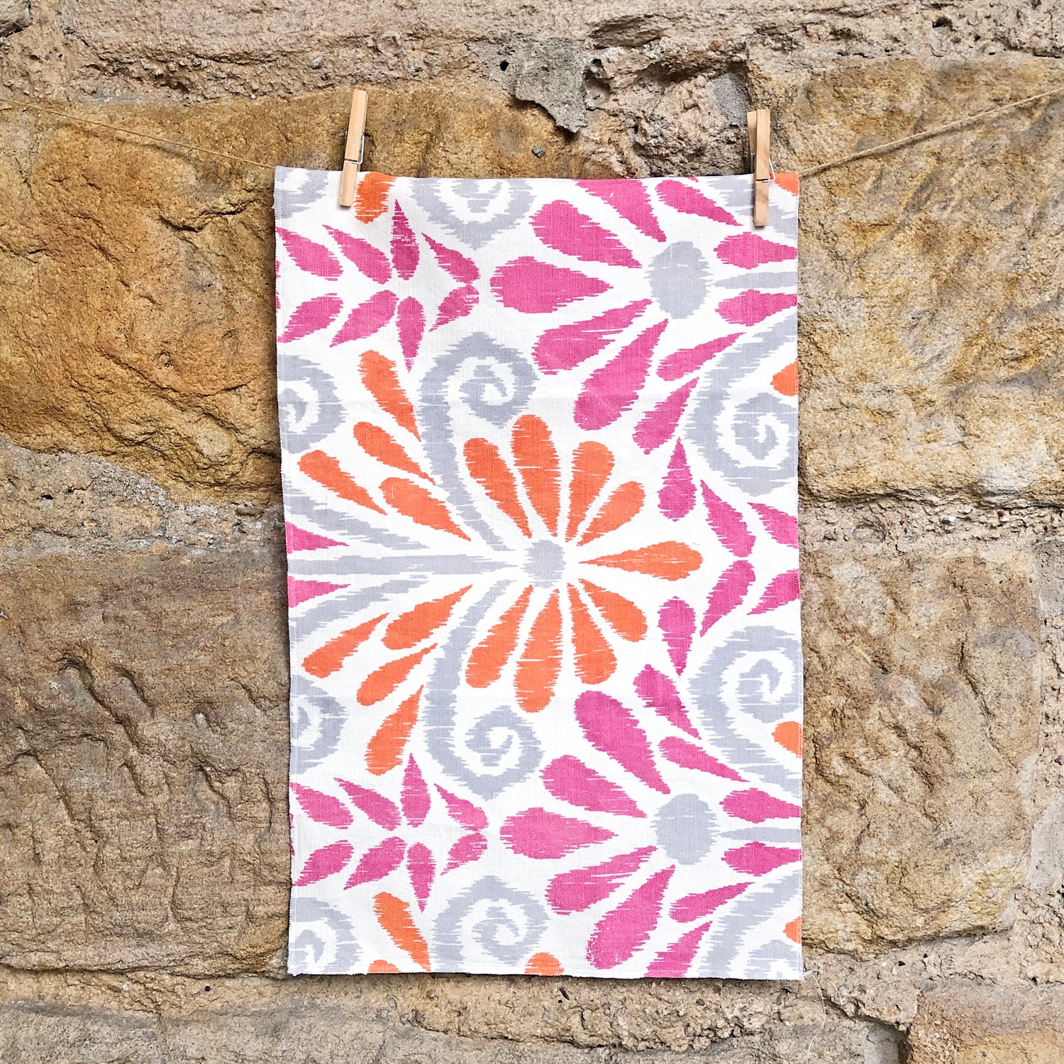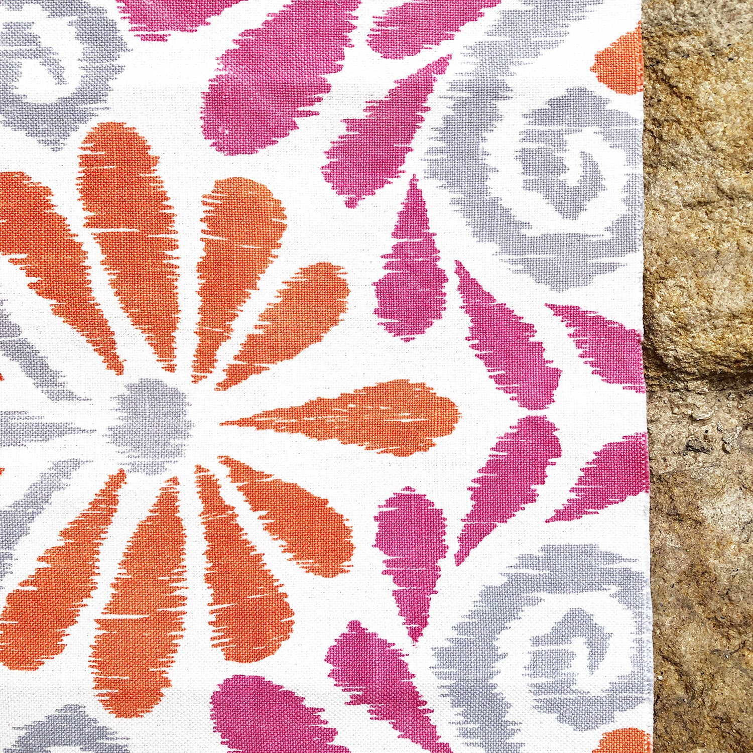 Hand block-printed fabric in summery pink and orange by celebrated designer John Robshaw.